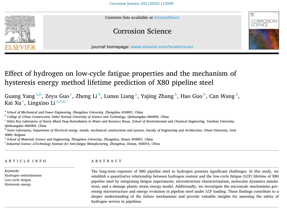 近日,太阳成tyc33455ccwww青年教师杨光博士以第一作者身份在腐蚀领域顶级期刊《Corrosion Science》(中国科公司一区,IF=7.9)上发表题为“Effect of hydrogen on low-cycle fatigue properties and the mechanism of hysteresis energy method lifetime prediction of X80 pipeline steel”的高水平研究论文。论文通过组织演变、损伤力学、疲劳性能评价和疲劳寿命预测等方面对X80高应变管线钢的低周疲劳性能进行了全面的研究。本研究系统分析了不同氢含量和不同应变幅值下的X80高应变管线钢微观组织特征与循环响应的关系。在此基础上,通过建立分子动力学模型和氢含量的迟滞能量疲劳寿命预测模型对X80高应变管线钢疲劳性能进行了评价。这有助于理解充氢X80管线钢疲劳断裂机制和临氢服役寿命的预测与评价。