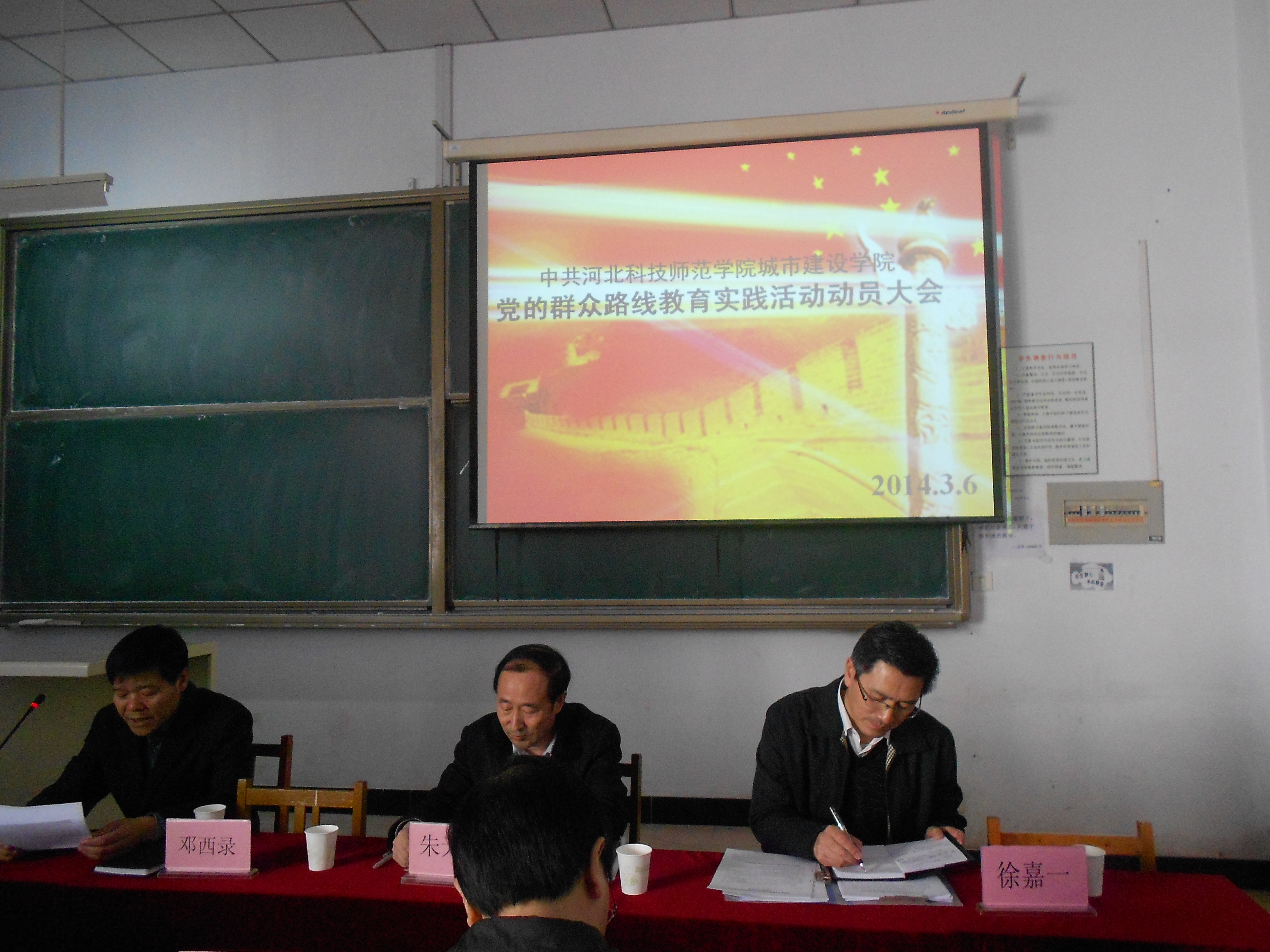 2014年3月6日下午,公司党的群众路线教育实践活动动员大会在逸夫教学楼A103召开,公司党委书记辛彦怀同志参加大会,公司党的群众路线教育实践活动第三督导组组长徐嘉一同志代表督导组讲话,公司党委书记朱天志同志做动员讲话,邓西录经理主持大会,公司督导组成员刘志飞、秦皇岛市政协委员王辉东、公司全体教师、员工党员共72人参加了大会。
